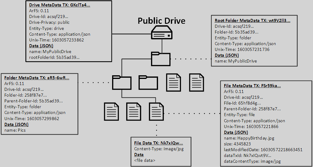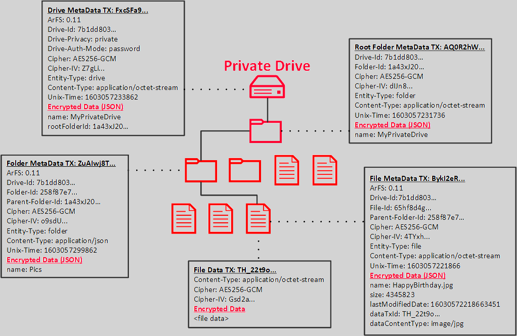 ArFS entities, therefore, have their data split between being stored as tags on their transaction header and encoded as JSON and stored as the data of a transaction. In the case of private entities, JSON data and file data payloads are always encrypted according to the protocol processes defined below.
